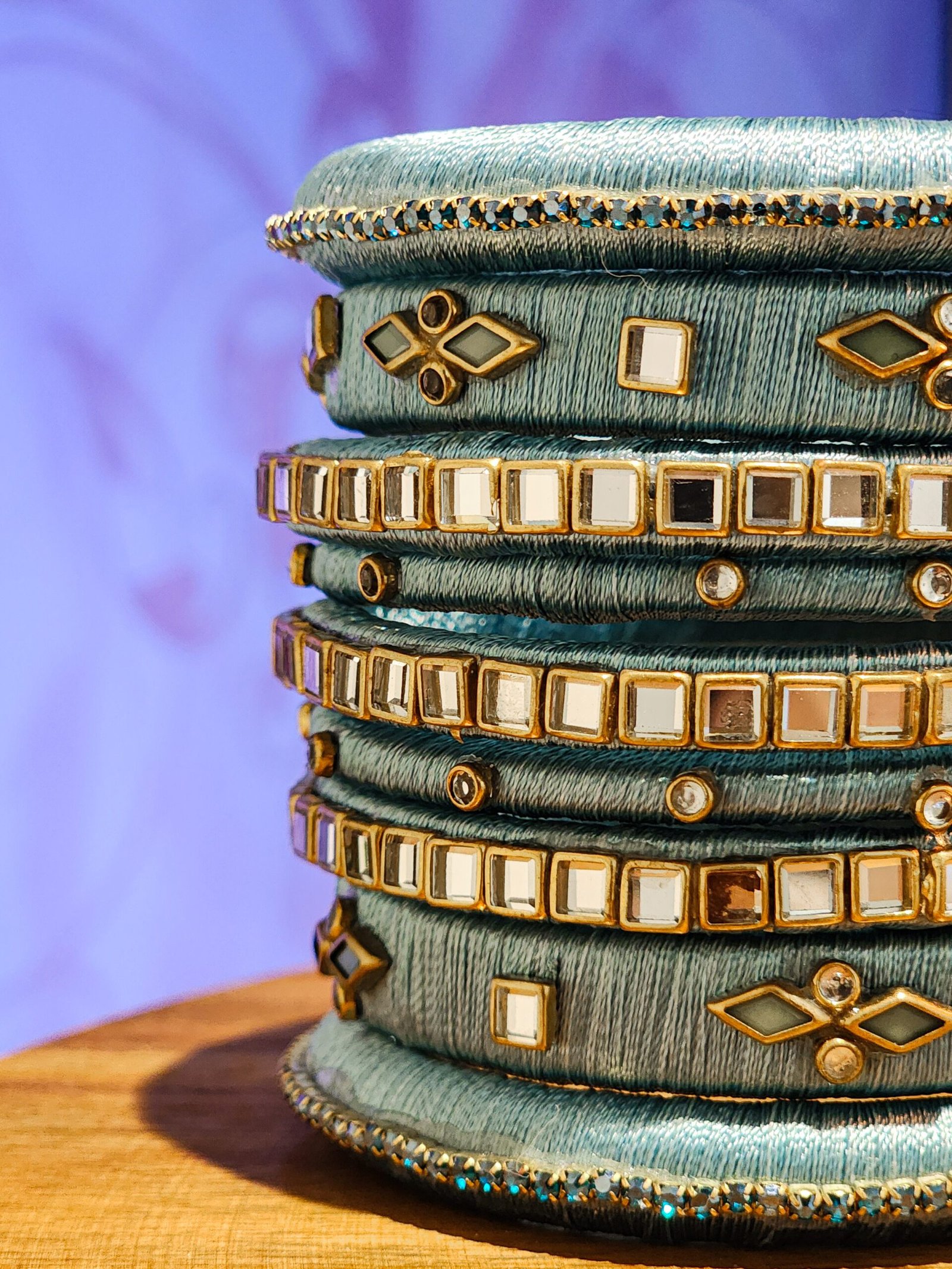 Stackable periwinkle bangles with metallic embroidery and sapphire stones, merging traditional craftsmanship with contemporary wearability.
